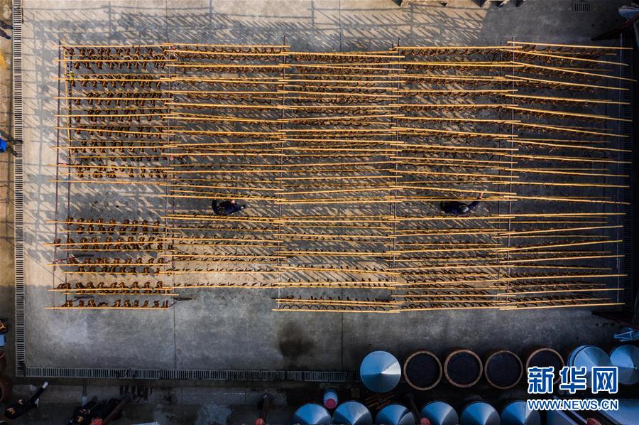 12月3日,安昌古鎮(zhèn)傳統(tǒng)臘味作坊里曬滿(mǎn)了各種手工制作的紹興臘味(無(wú)人機(jī)拍攝)。新華社記者徐昱攝