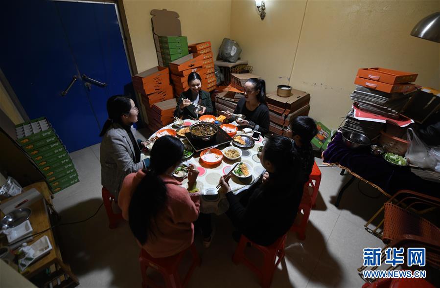 李柳萍(后排右一)在特產(chǎn)館里和員工吃晚飯(12月14日攝)。新華社記者黃孝邦攝