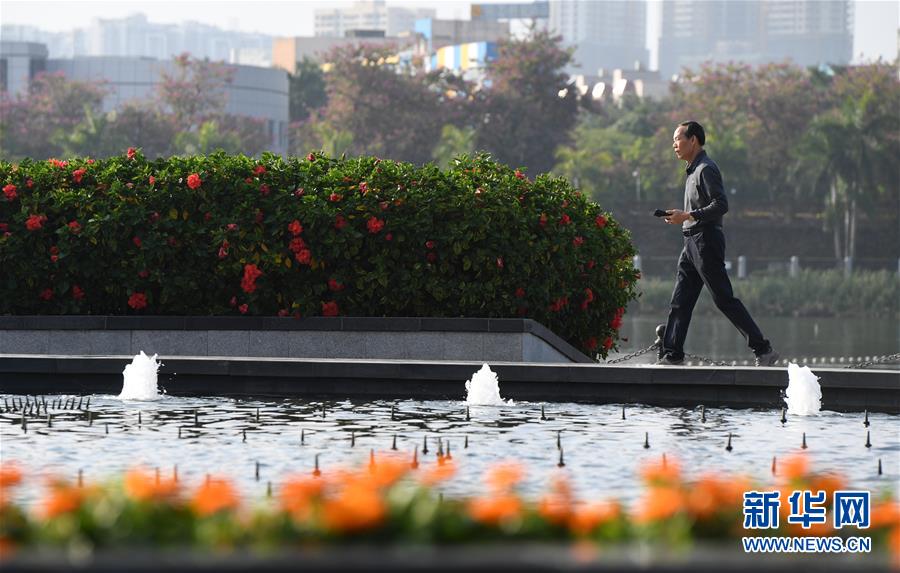 12月17日,市民從南寧市南湖邊綠樹鮮花間走過(guò)。 新華社記者 陸波岸 攝