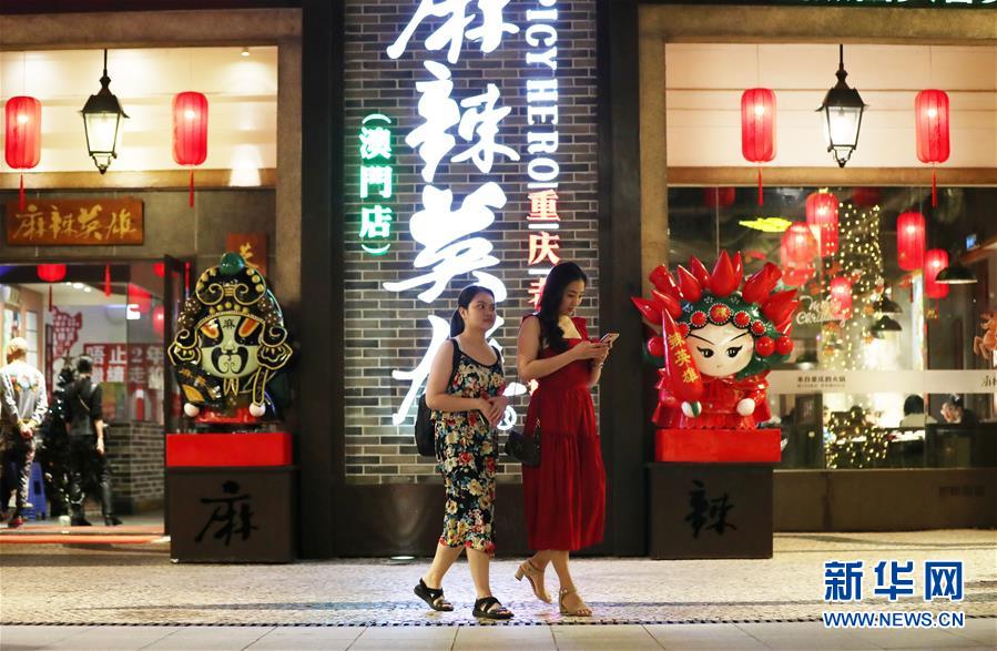 12月17日,在澳門漁人碼頭附近,人們從一家火鍋店門前經(jīng)過(guò)。新華社記者李鋼攝