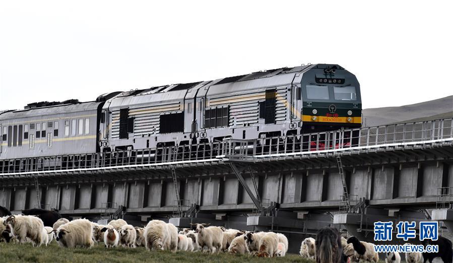 這是羊群和青藏鐵路上行駛的列車(chē)(6月10日攝)。新華社記者覺(jué)果攝