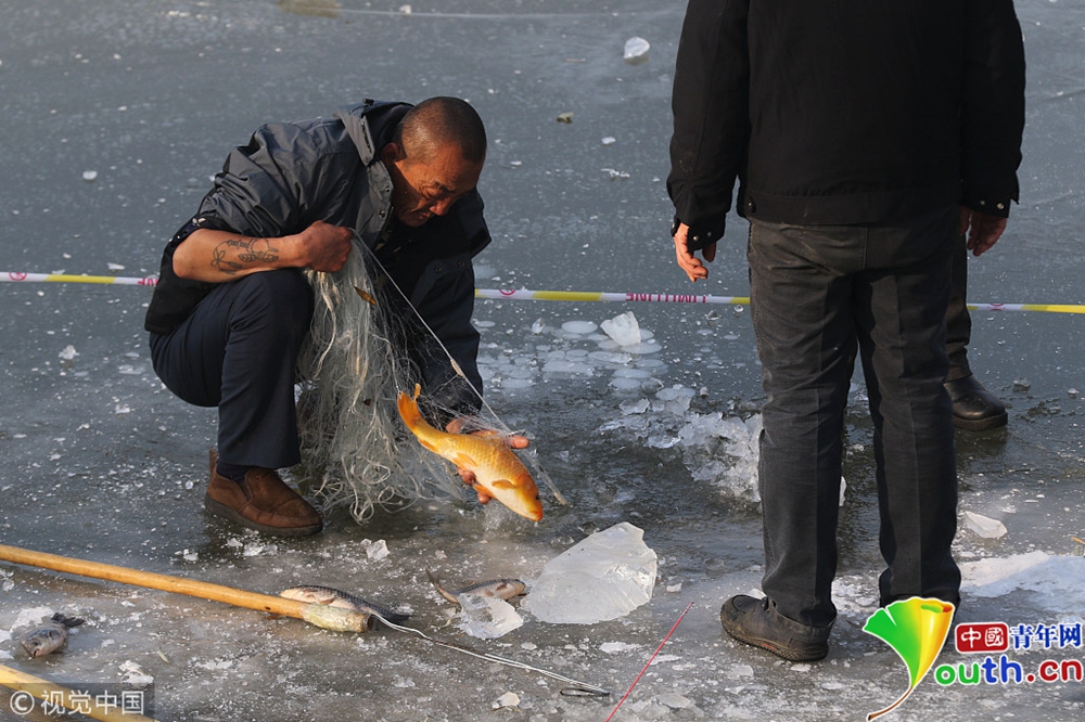 民眾鑿冰下網(wǎng)捕魚。