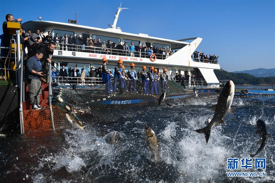 當日,浙江省杭州市淳安縣千島湖中心湖區(qū)上演巨網(wǎng)捕魚,30余名捕撈隊員經(jīng)過半個多小時拉網(wǎng),獲得大豐收。