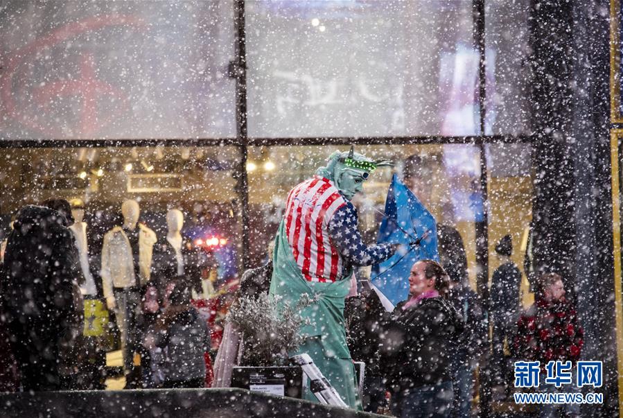 12月18日,在美國(guó)紐約時(shí)報(bào)廣場(chǎng),一名打扮成“自由女神像”的街頭表演者在雪中等待生意。新華社記者 王迎 攝