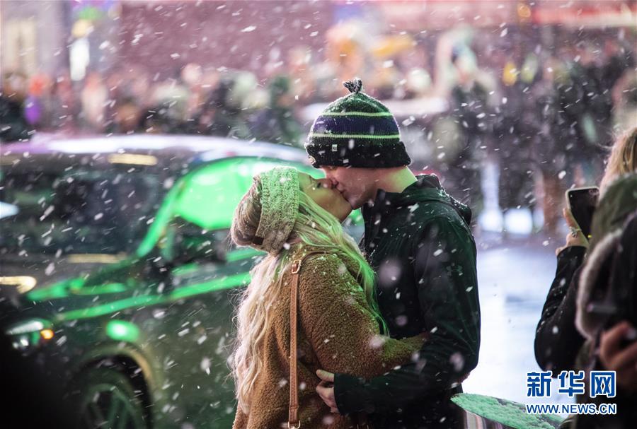 12月18日,在美國(guó)紐約時(shí)報(bào)廣場(chǎng),一對(duì)情侶在雪中擁吻。新華社記者 王迎 攝