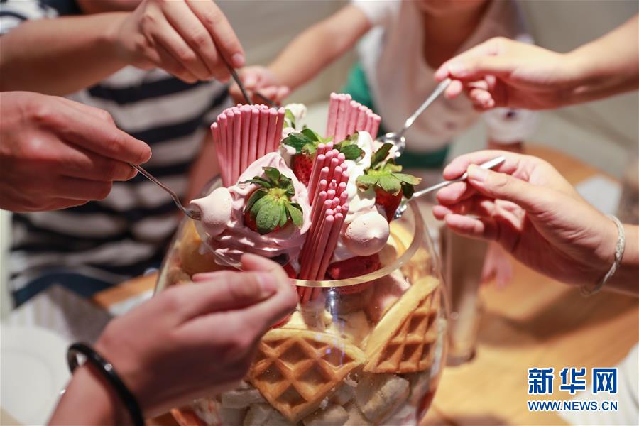 2019年7月28日,在泰國曼谷,顧客在一家冰淇淋店分享冰淇淋。這家冰淇淋店因為其超大款的冰淇淋走紅網(wǎng)絡,吸引許多游客前去拍照打卡。 新華社記者 張可任 攝