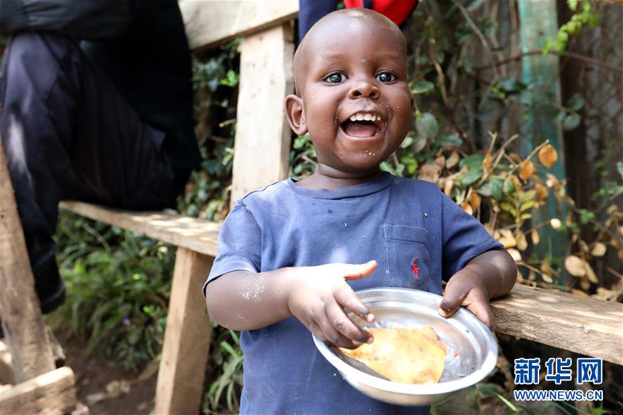 2019年9月1日,在肯尼亞內(nèi)羅畢的一個街邊攤位,一名兒童品嘗薩摩薩??夏醽喖皷|非地區(qū)的傳統(tǒng)面食薩摩薩是一種三角形的油酥點心,由薄面皮包裹豆類、蔬菜及牛羊肉餡后,下鍋油炸而成。 新華社記者 王騰 攝
