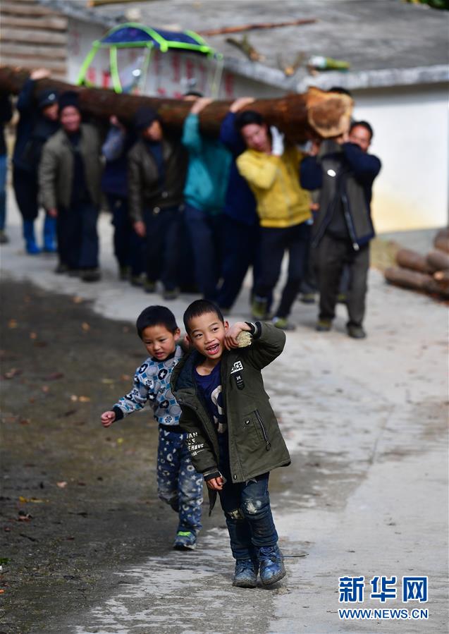 烏英苗寨的小朋友幫大人抬小木頭,準備用于制作蘆笙柱(12月2日攝)。新華社記者黃孝邦攝