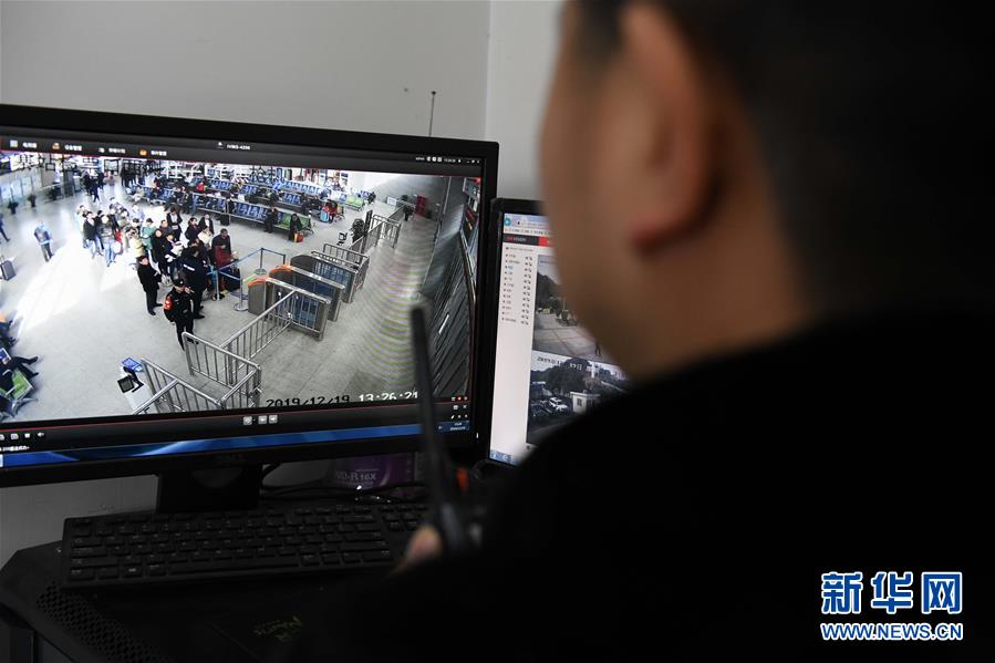 金寨火車站派出所民警何津超通過監(jiān)控視頻了解候車大廳內(nèi)的實(shí)時情況(12月19日攝)。新華社記者張端攝