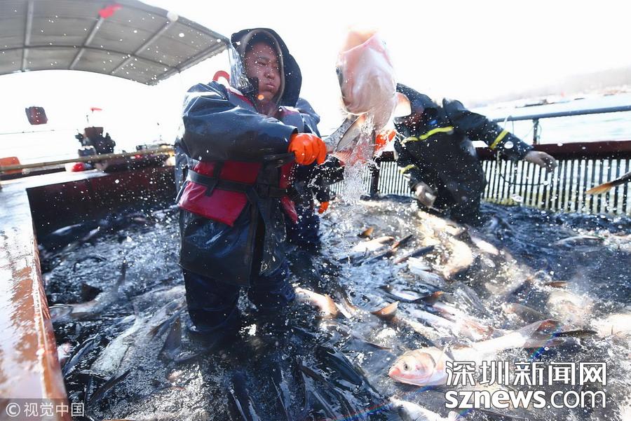 2018年12月26日,吉林松原,查干湖迎來了“紅網(wǎng)”,單網(wǎng)捕撈約30萬斤。