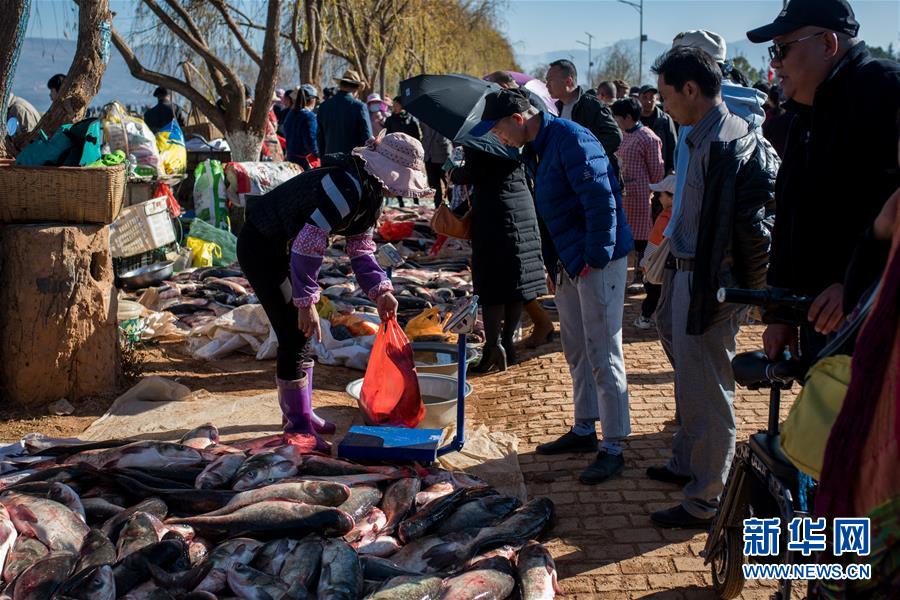 12月25日,人們在星云湖畔的老河咀魚市選購剛捕撈的鮮魚。新華社記者胡超攝