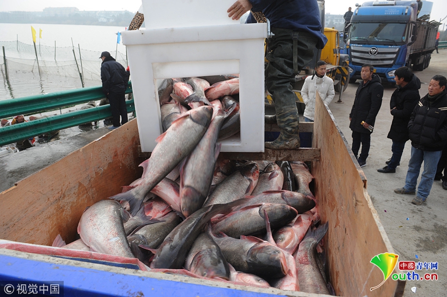 1月6日,安徽省阜陽市潁上縣八里河漁場正式開始進(jìn)行冬季大捕魚,捕獲的一條重達(dá)78斤的“頭魚”拍出88萬元,現(xiàn)場吸引眾多客商和廣大群眾觀看。據(jù)悉,此次所得拍賣款全部用于當(dāng)?shù)孛撠毠?。圖片來源:視覺中國