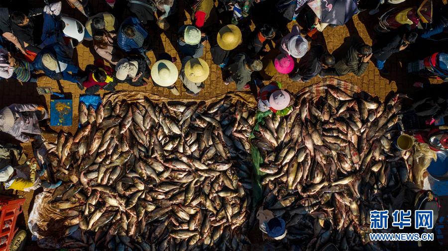 星云湖畔的老河咀魚市熱鬧非凡(12月25日無人機拍攝)。新華社記者胡超攝