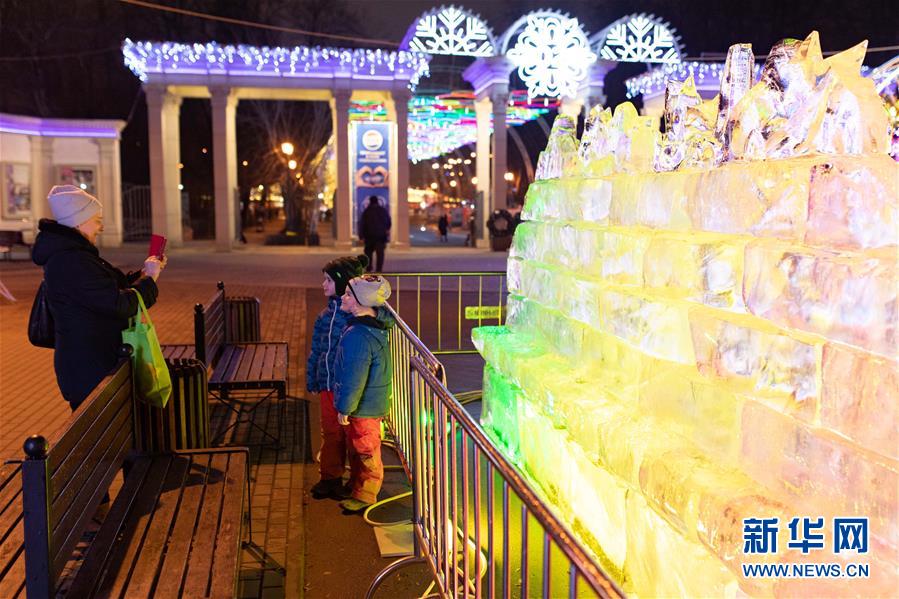 12月24日,在俄羅斯首都莫斯科,人們參觀冰雕藝術(shù)展。  新華社記者 白雪騏 攝