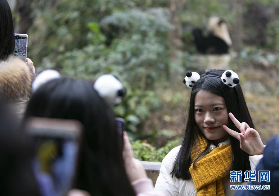 1月1日,在成都大熊貓繁育研究基地,游客在與大熊貓合影。  新華社記者 李夢(mèng)馨 攝