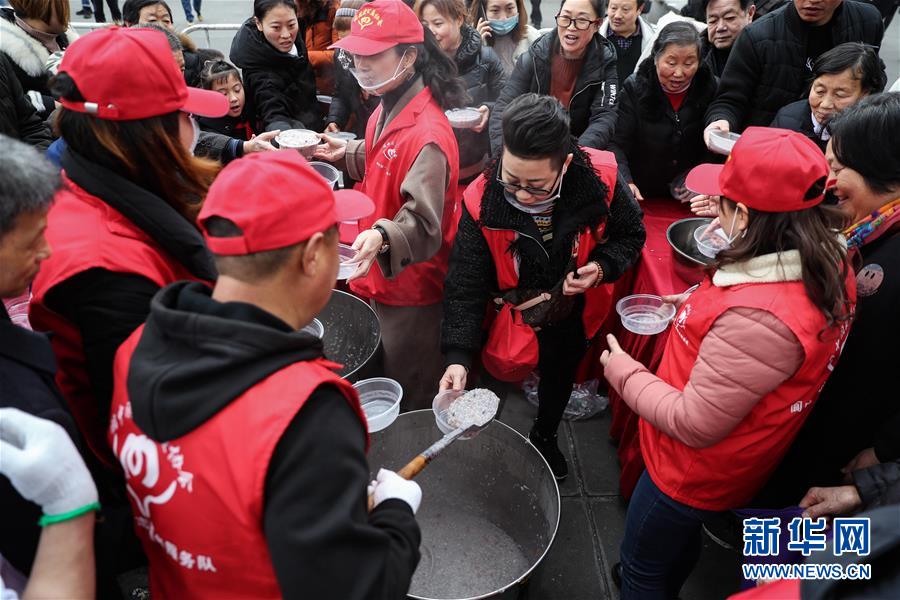 1月2日,志愿者在閬中古城貢院廣場給大家發(fā)放臘八粥。 當(dāng)日是農(nóng)歷臘月初八臘八節(jié),四川閬中古城舉行“萬人同品臘八粥”活動(dòng),當(dāng)?shù)鼐用窈捅姸嘤慰驮谪曉簭V場免費(fèi)享用臘八粥。 新華社記者 江宏景 攝