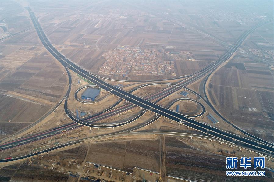 這是1月3日拍攝的北京大興國際機場北線高速公路廊坊段王場互通樞紐(無人機照片)。