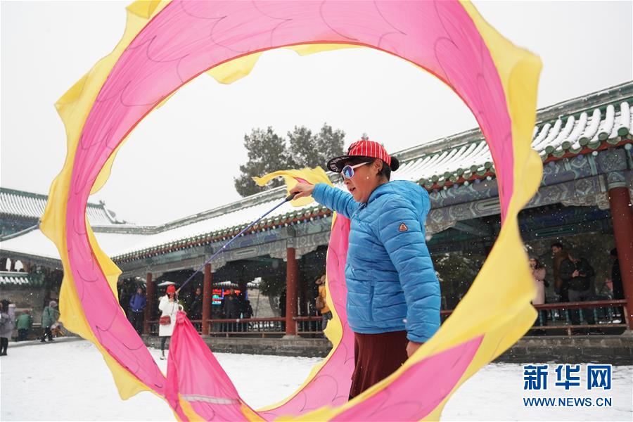 12月16日,在北京天壇公園,一名市民雪中健身。當(dāng)日,北京迎來(lái)降雪天氣。新華社記者鞠煥宗攝