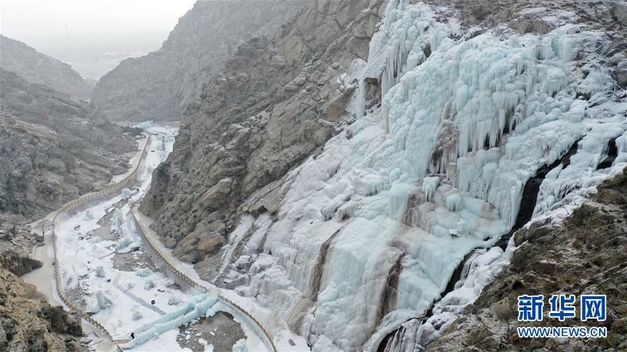 這是1月7日拍攝的賀蘭山巖畫景區(qū)內(nèi)的冰瀑景觀(無人機(jī)照片)。近日,寧夏賀蘭山巖畫景區(qū)內(nèi),自然山泉凍結(jié)冰瀑和人造冰瀑景觀相結(jié)合,形成多處冰瀑景觀,山間形態(tài)各異的冰掛、冰柱鬼斧神工,蔚為壯觀,吸引眾多游客前來觀賞。  新華社記者 王鵬 攝