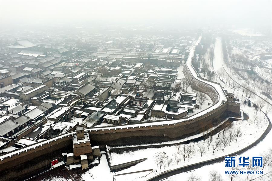 1月5日拍攝的平遙古城城墻與護(hù)城河(無(wú)人機(jī)照片)。新華社記者詹彥攝