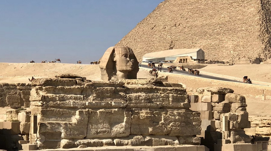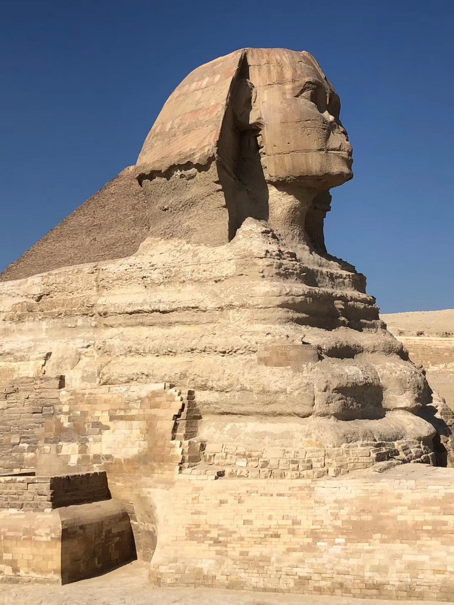 此像高20米,長57米,算上兩個前爪,全長72米。它頭戴“奈姆斯”皇冠,兩耳側(cè)有扇狀的“那姆斯”頭巾下垂,前額上刻著圣蛇浮雕,下頜有帝王的標志,下垂的長須,脖子上圍著項圈,鷹的羽毛圖案打扮著獅身。孫衛(wèi)南攝