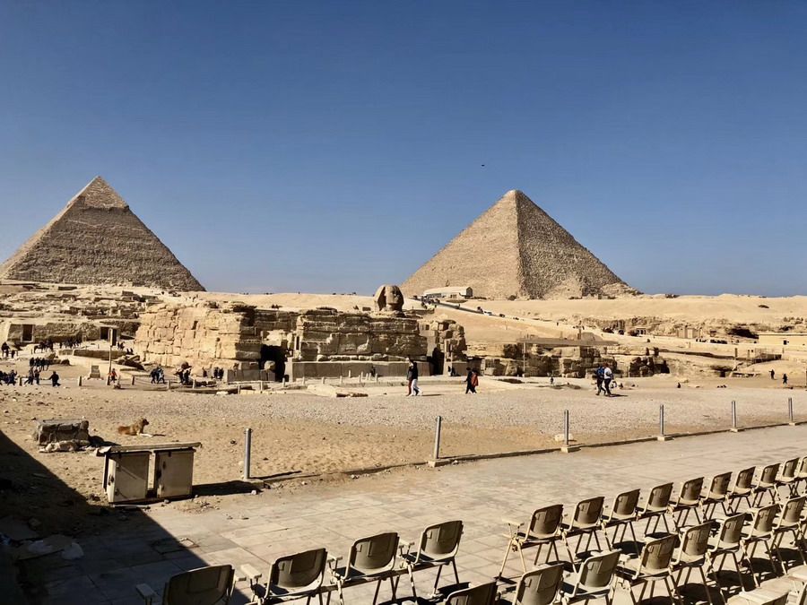 此像高20米,長57米,算上兩個前爪,全長72米。它頭戴“奈姆斯”皇冠,兩耳側(cè)有扇狀的“那姆斯”頭巾下垂,前額上刻著圣蛇浮雕,下頜有帝王的標(biāo)志,下垂的長須,脖子上圍著項圈,鷹的羽毛圖案打扮著獅身。孫衛(wèi)南攝