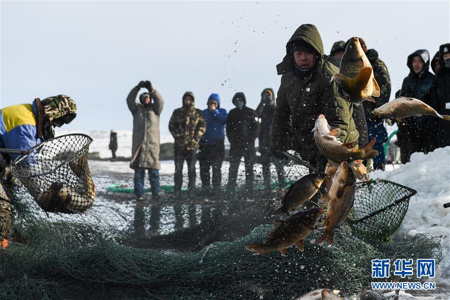 12月18日,工作人員將冬捕魚打撈上岸。當(dāng)日,位于內(nèi)蒙古呼倫貝爾大草原上的諾干湖舉行冬捕活動,吸引不少游客前來觀看。冬日的諾干湖冰雪覆蓋,諾干湖冬捕也是當(dāng)?shù)囟韭糜蔚奶厣顒又弧P氯A社記者劉磊攝