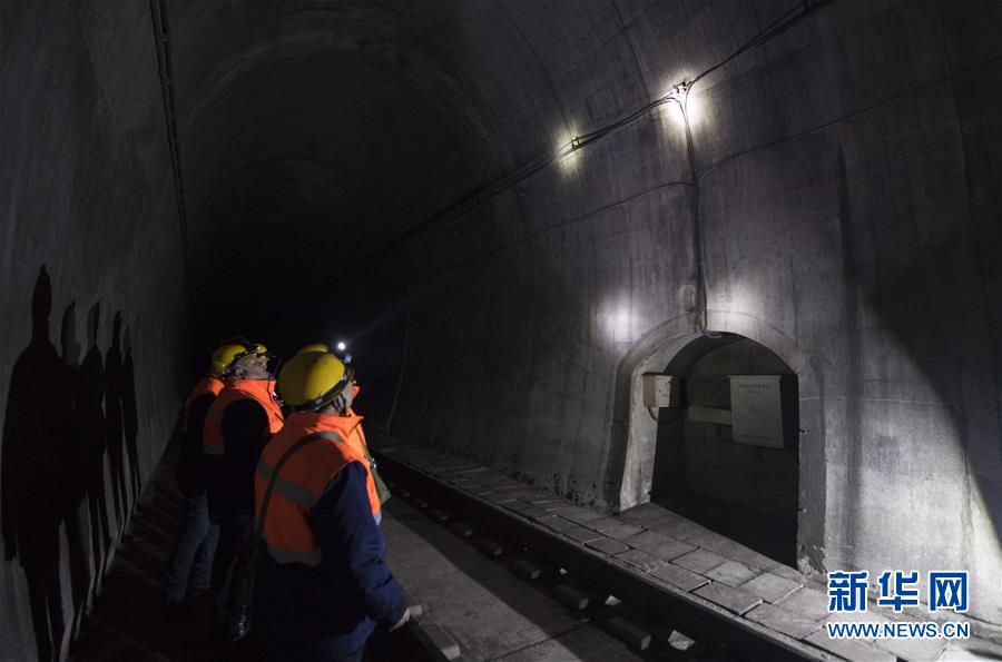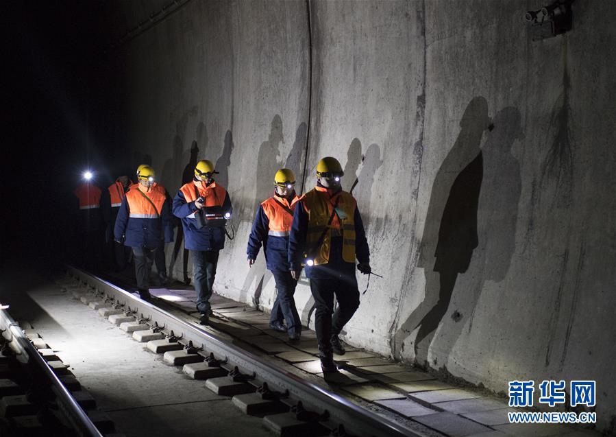 1月8日,西羅奇維修工隊(duì)工人們?cè)谖髁_奇嶺一號(hào)隧道附近等待列車(chē)經(jīng)過(guò)。新華社記者王毓國(guó)攝