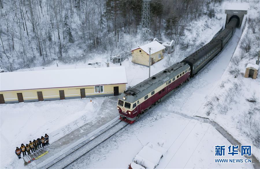1月7日,西羅奇維修工隊(duì)工作人員在雪地上寫(xiě)下“一路平安”為經(jīng)過(guò)的列車(chē)旅客送上祝福(無(wú)人機(jī)照片)。新華社記者王毓國(guó)攝