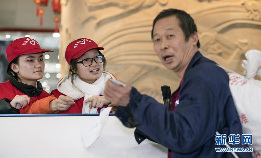 1月14日,在西安北站候車大廳,青年志愿者在為旅客服務(wù)。路再遠、再艱辛,也擋不住回家的腳步。在西安北站的每一個角落,處處充滿溫情和歸鄉(xiāng)的盼望。連日來,西安北站日均發(fā)送旅客12.1萬人次,一列列春運的列車,載著中國人的鄉(xiāng)愁,駛向遠方。新華社記者陶明攝