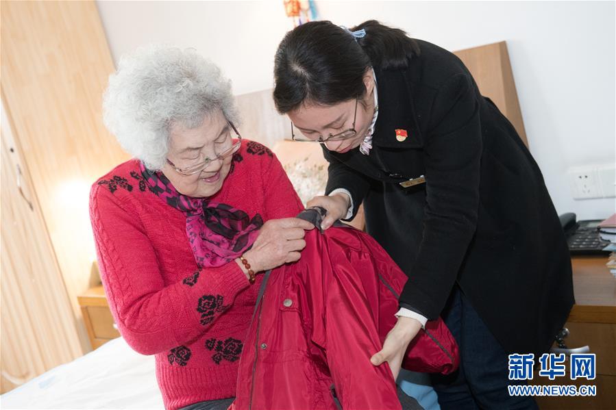1月17日,張丹俠(右)幫助手臂曾經骨折的王育華穿外衣。新華社記者 翁忻旸 攝
