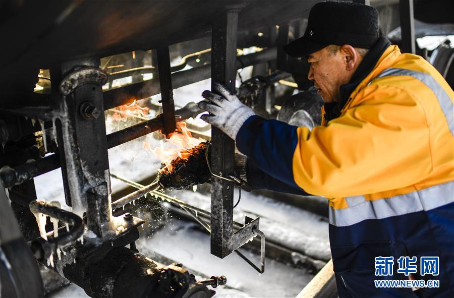 林海間的“送水小火車” 調(diào)車員對“送水小火車”進(jìn)行出行前的檢查作業(yè)(1月17日攝)。新華社記者 許暢 攝