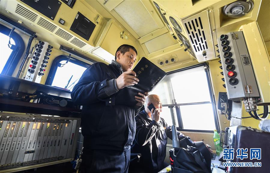 機車司機杜洪峰(右)與副司機謝振國進行開車前的例行檢查(1月17日攝)。新華社記者 許暢 攝
