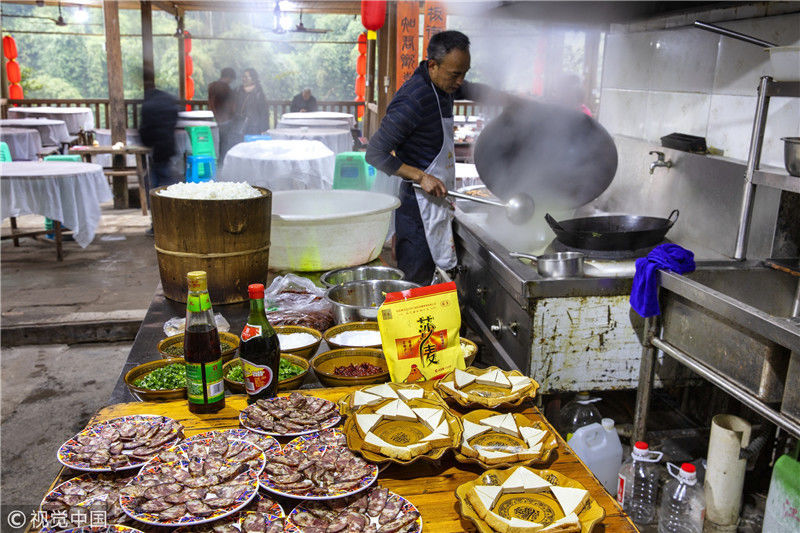 2019年1月26日,重慶中山古鎮(zhèn),880桌“千米長宴”5萬人共品年味。街坊們在頭天就開始準(zhǔn)備各種菜肴與小吃。