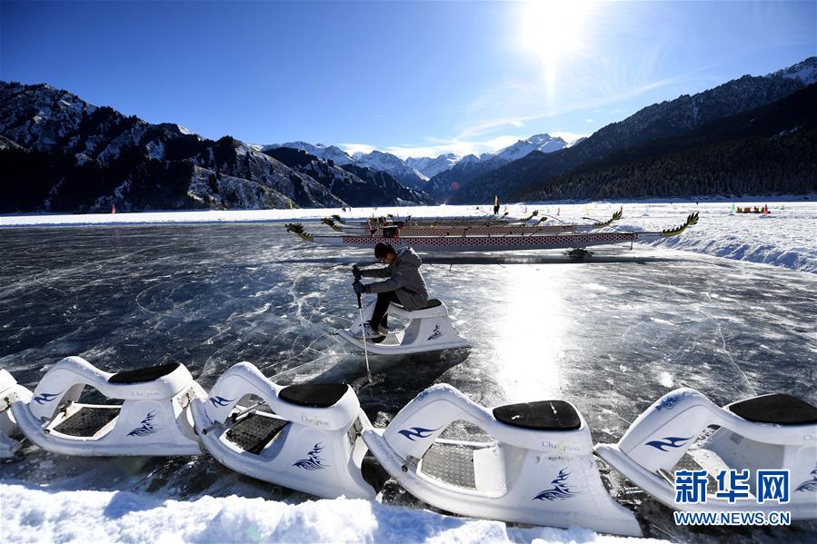 1月18日,游客在新疆天池景區(qū)玩冰上龍舟。新華社記者 沙達提 攝