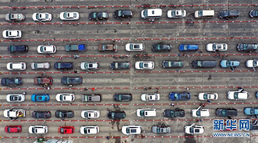 1月19日,車輛在??谛阌⒏圯喍纱a頭等待登船(無人機(jī)照片)。 新華社記者 郭程 攝