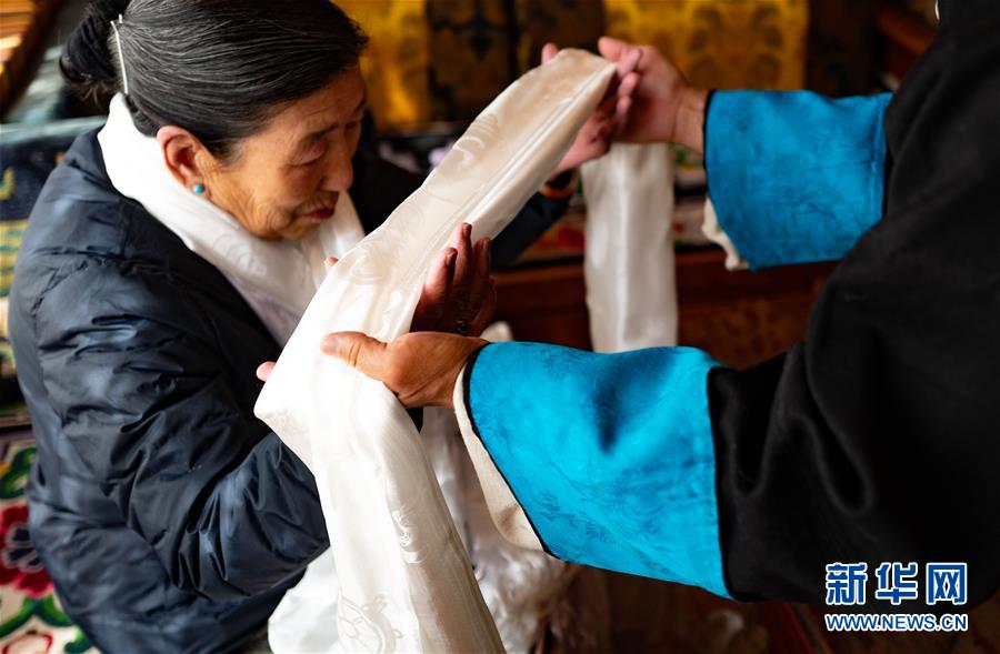 一名藏族群眾給長輩敬獻哈達,祝福長壽(2月24日攝)。  新華社記者 普布扎西 攝