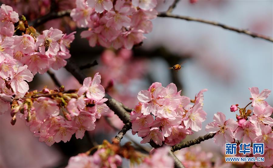 2月24日,在上海松江辰山植物園,蜜蜂在河津櫻櫻花叢中飛舞。 新華社記者 方喆 攝