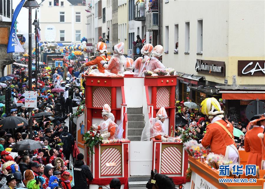 2月24日,在德國(guó)科隆,人們乘坐花車參加“玫瑰星期一”大游行。