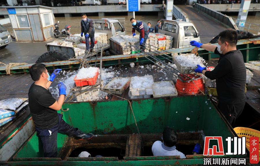 2020年2月24日,浙江舟山國際水產(chǎn)城碼頭,當?shù)氐墓と苏趧偪堪兜臐O船上卸魚貨,現(xiàn)場十分繁忙。