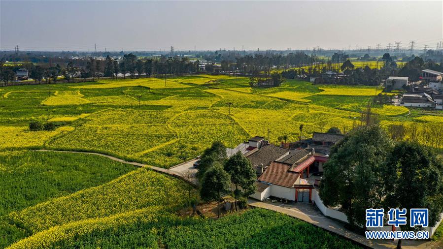 2月25日在四川省崇州市農(nóng)業(yè)產(chǎn)業(yè)功能區(qū)拍攝的油菜花田(無人機照片)。 初春時節(jié),正值農(nóng)時。成都平原西部的大邑、崇州等縣市油菜長勢良好,一片生機盎然的景象。  新華社記者 王曦 攝