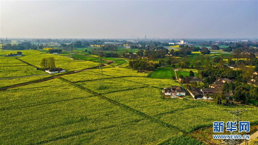 2月25日在四川省崇州市農業(yè)產業(yè)功能區(qū)拍攝的油菜花田(無人機照片)。初春時節(jié),正值農時。成都平原西部的大邑、崇州等縣市油菜長勢良好,一片生機盎然的景象。新華社記者王曦攝