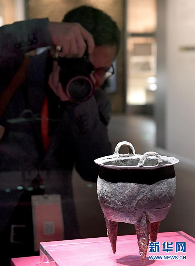 參觀者在二里頭夏都遺址博物館拍攝展品“網格紋銅鼎”(2019年10月19日攝)。新華社記者李安攝