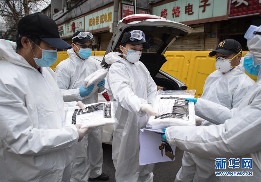 2月29日,W大武漢緊急救援隊(duì)隊(duì)長王紫懿(中)為隊(duì)員發(fā)放防護(hù)服。她說,現(xiàn)在防護(hù)物資十分緊缺,隊(duì)員們都在省著用,希望能撐到疫情結(jié)束。新華社記者 肖藝九 攝