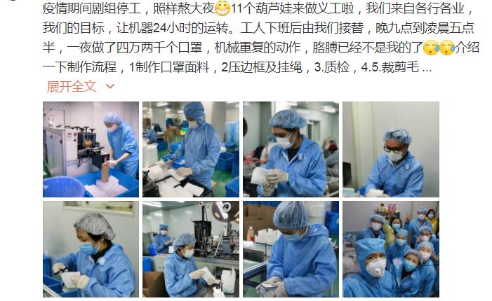 微博上,高鑫寫(xiě)道:“疫情期間劇組停工,照樣熬大夜。11個(gè)葫蘆娃來(lái)做義工啦,我們的目標(biāo),讓機(jī)器24小時(shí)運(yùn)轉(zhuǎn)。工人下班后由我們接替,晚九點(diǎn)到凌晨五點(diǎn)半,一夜做了42000個(gè)口罩,機(jī)械重復(fù)的動(dòng)作,胳膊已經(jīng)不是我的了。”微博上他還介紹了做口罩的流程,圖文并茂,十分“走心”。