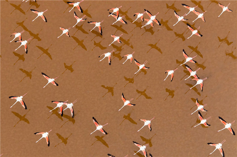 2018年1月9日訊(具體拍攝時間不詳), 西班牙卡迪茲海灣,數(shù)百只粉紅色的火烈鳥飛過五顏六色的鹽沼,在水面上形成令人驚嘆的倒影。太陽落山時分,攝影師Oscar Diez在300米高空的飛機上拍下這些令人震撼的照片。Oscar Diez/Solent News/視覺中國