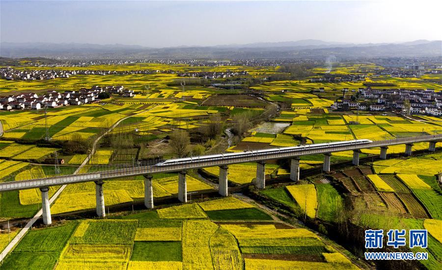 3月14日,一列動車從洋縣油菜花海中駛過(無人機(jī)照片)。近日,秦嶺南麓的陜西省漢中市洋縣14萬畝油菜花競相開放,美景如畫。新華社記者陶明攝