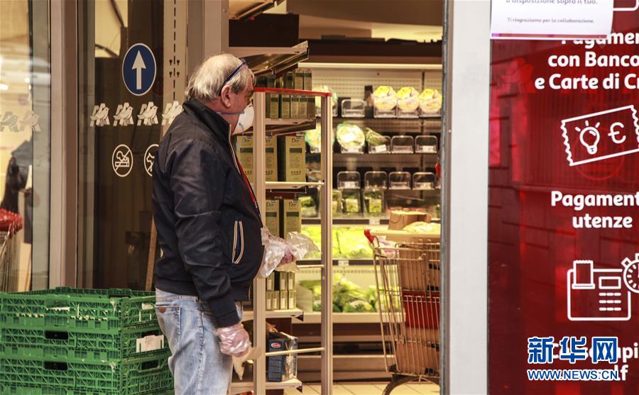 3月14日,在意大利首都羅馬,一名超市工作人員拿著手套,準備發(fā)放給顧客。