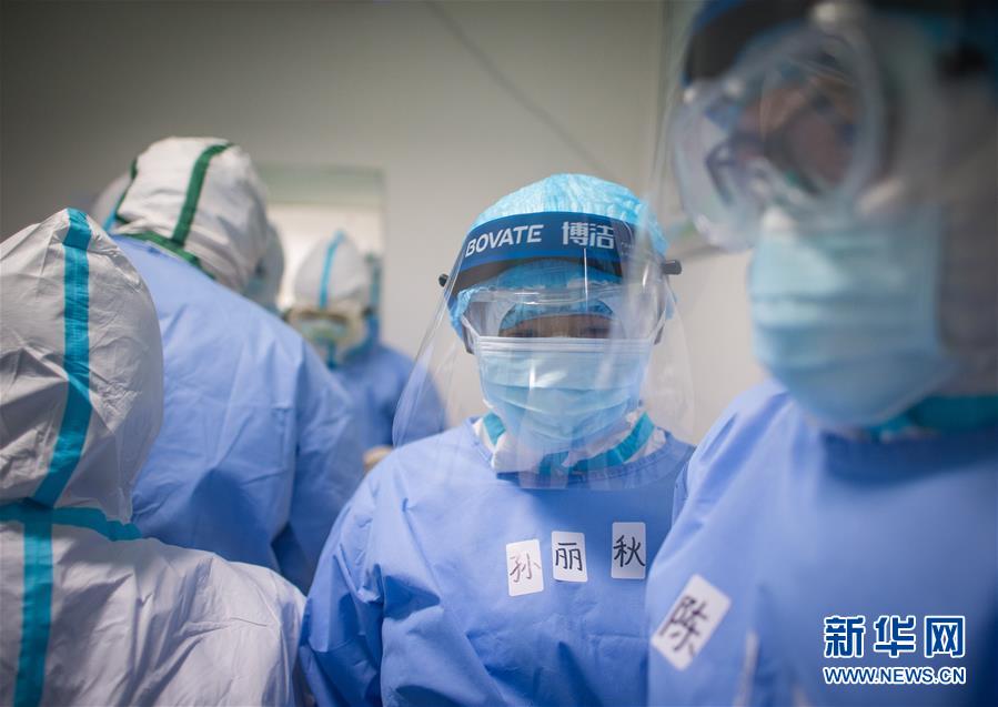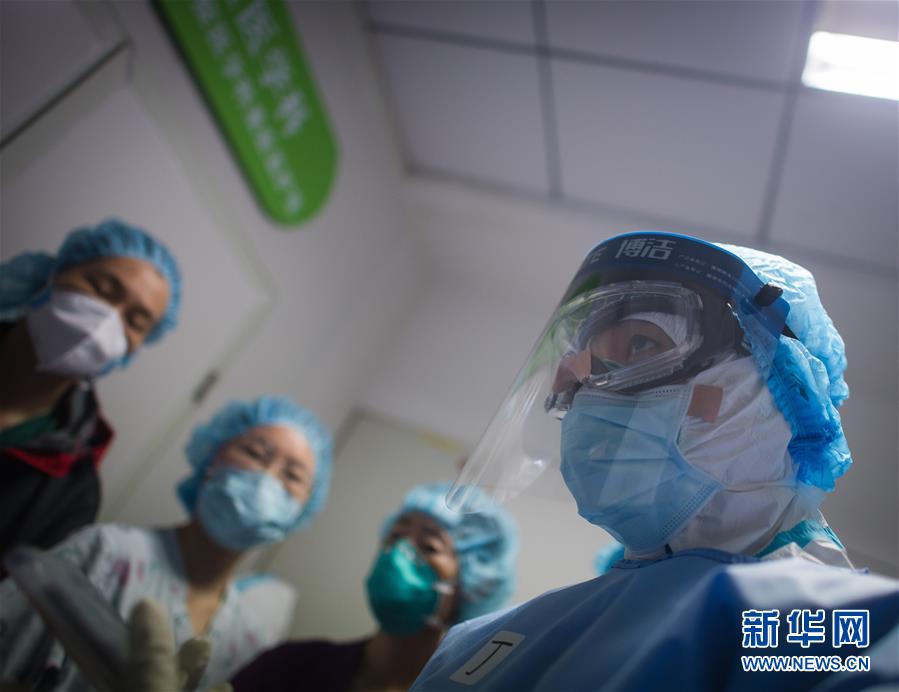 3月19日,在武漢市肺科醫(yī)院隔離病房,海南醫(yī)療隊隊員詹才露在現(xiàn)場忙碌。  新華社記者 肖藝九 攝