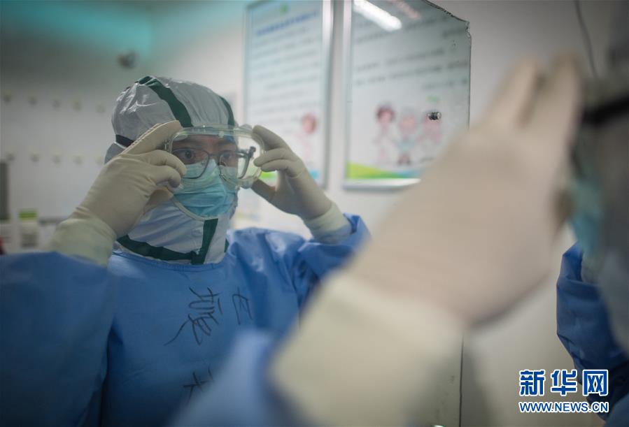 3月19日,在武漢市肺科醫(yī)院清潔區(qū),內(nèi)蒙古醫(yī)療隊隊員在穿戴護(hù)目鏡。  新華社記者 肖藝九 攝